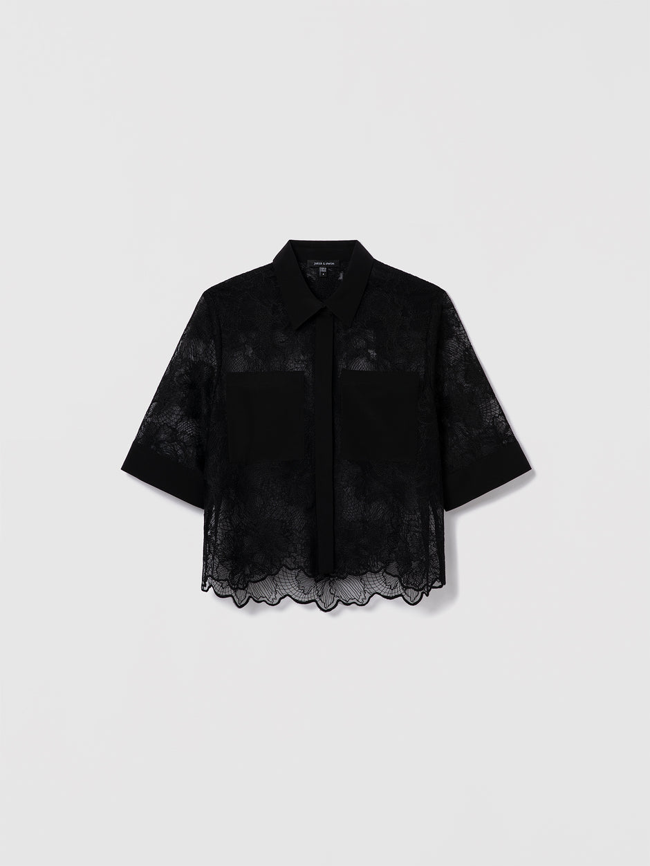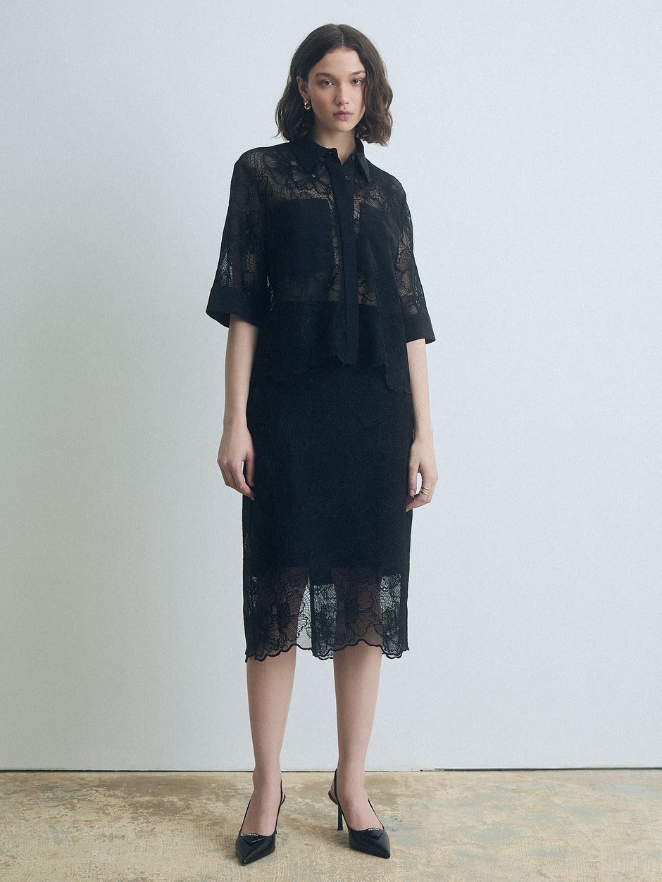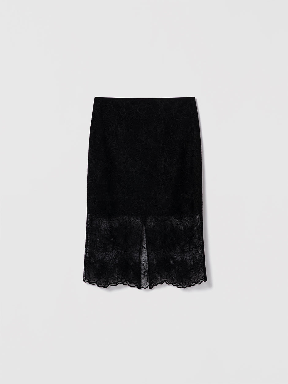 Lace skirt with a scalloped hem and back slit. Clean waistband, invisible back zipper. Fully lined in 100% silk.