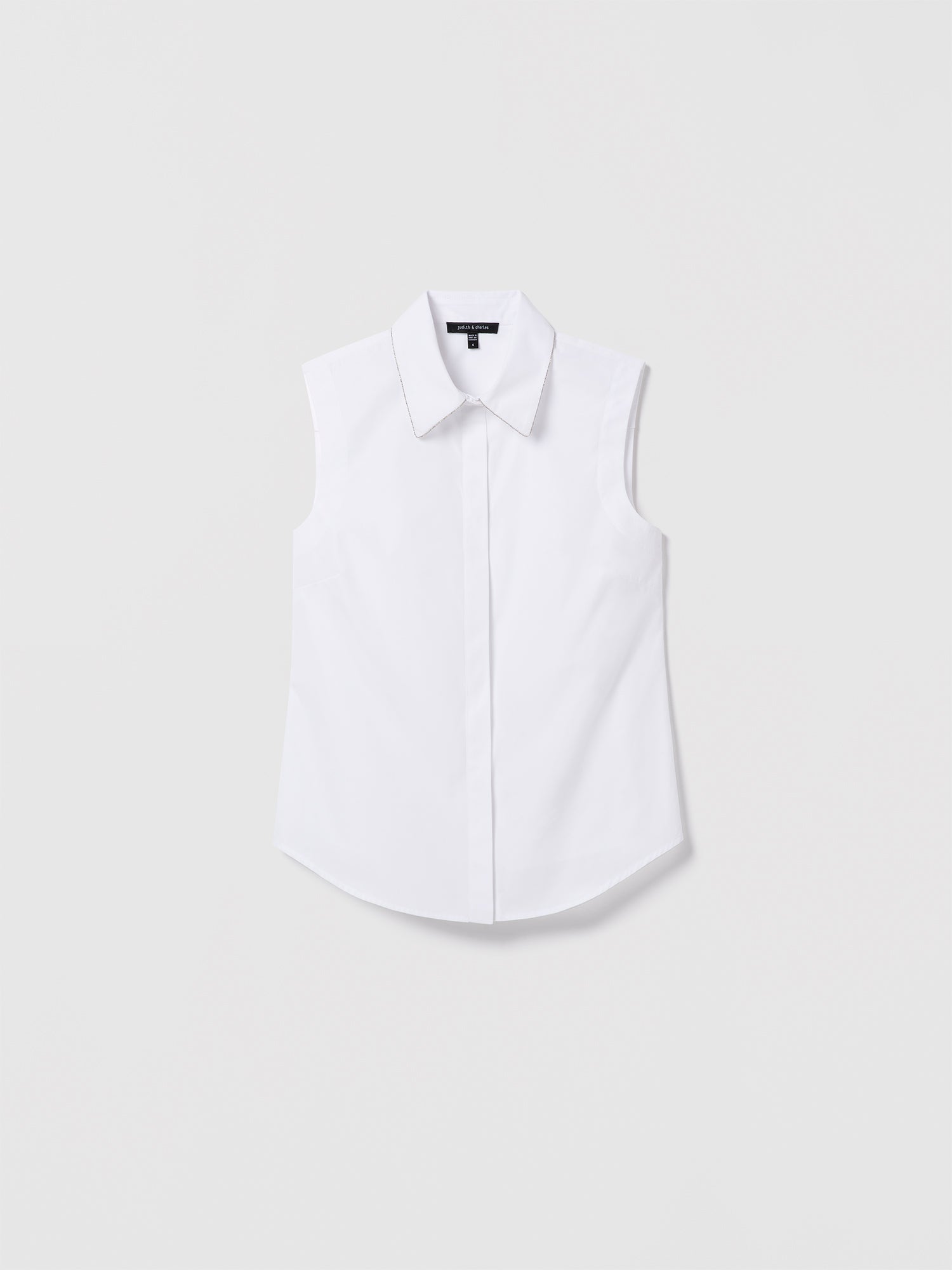 Sleeveless cotton poplin blouse with hidden button placket and ball trim collar, fitted silhouette, made in Canada from Italian fabric.