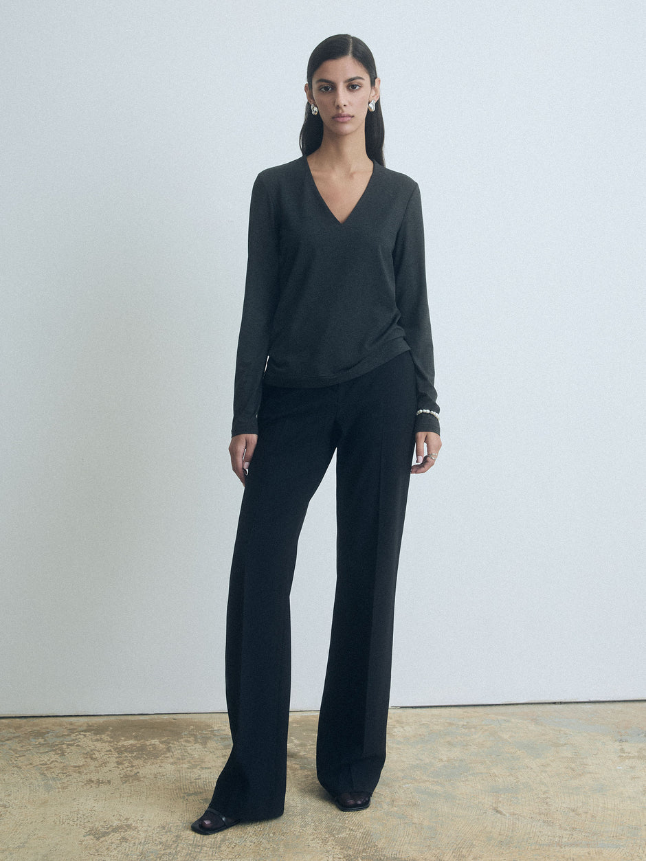 Fitted long-sleeve V-neck T-shirt in fluid viscose jersey.