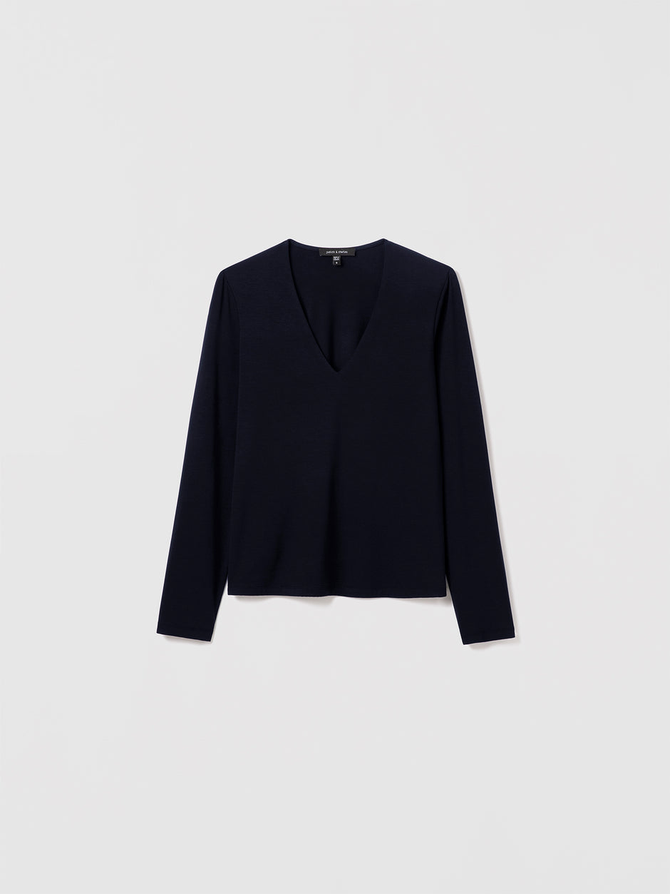 • Judith & Charles navy V-neck long-sleeve T-shirt in fluid viscose jersey, fitted silhouette.