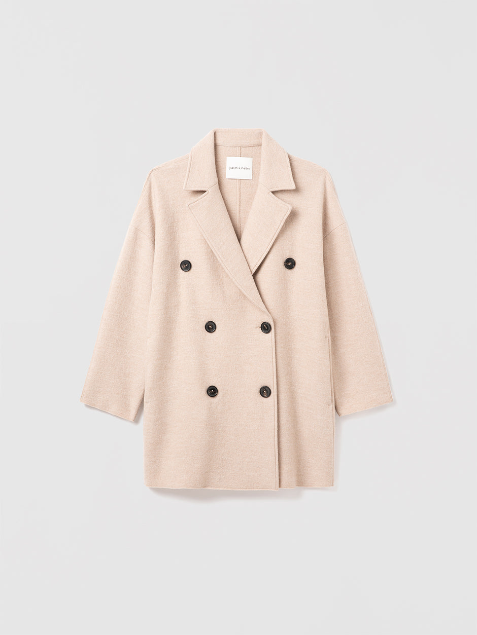 Double-breasted coat in virgin wool, made in Canada.