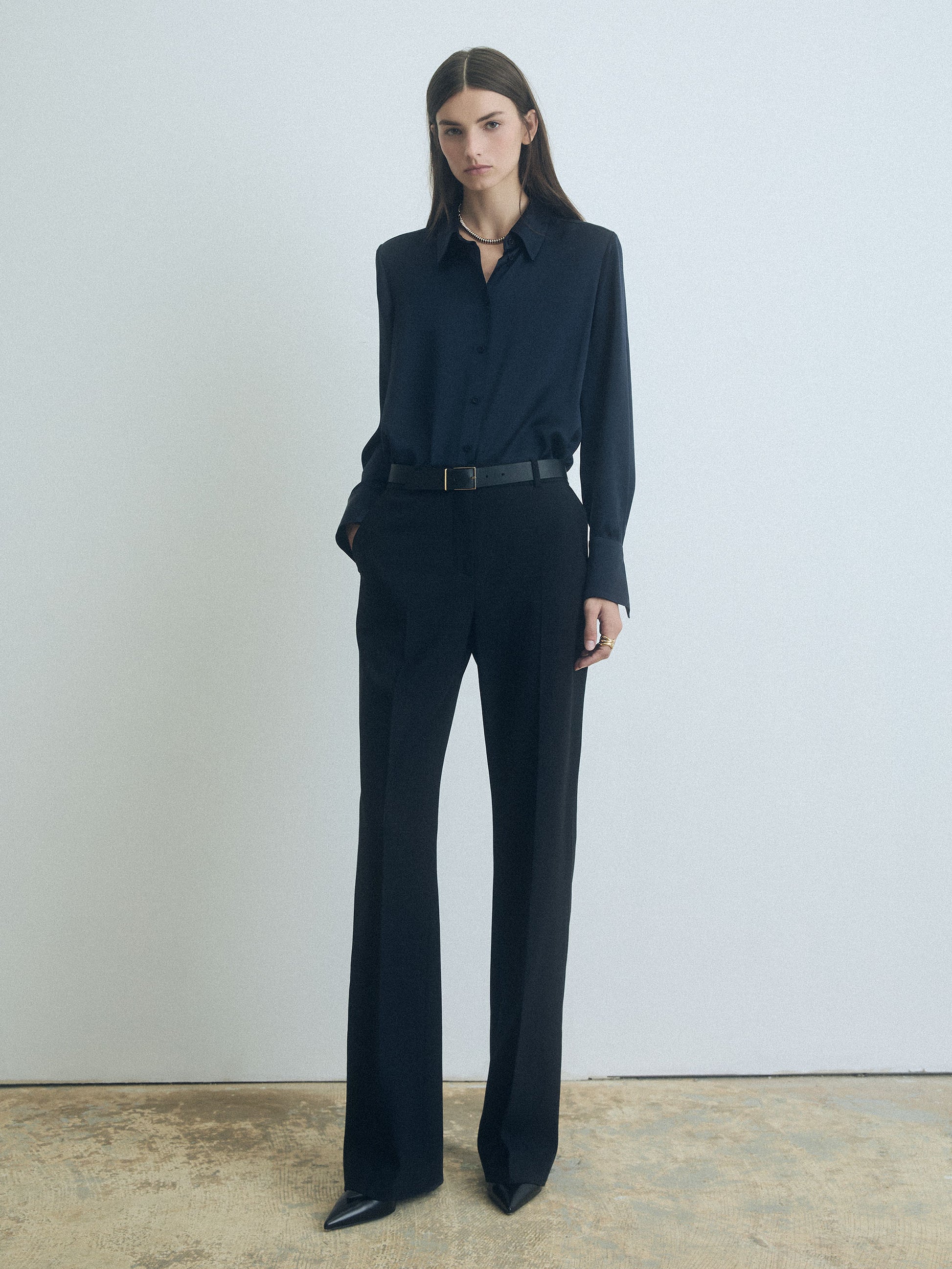 Long-sleeve satin silk blouse with a semi-fitted silhouette.
