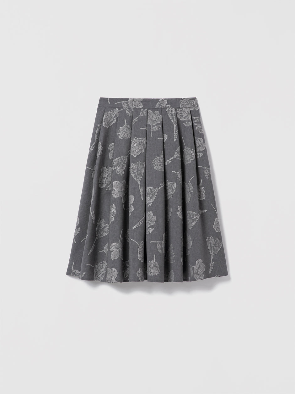 Floral jacquard skirt in stretch virgin wool by Loro Piana, below-the-knee length.