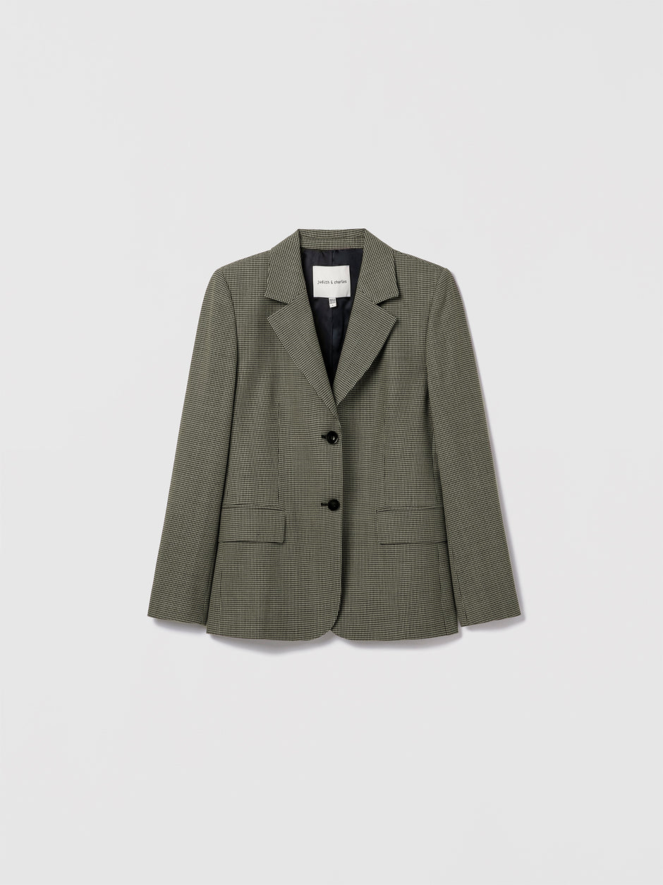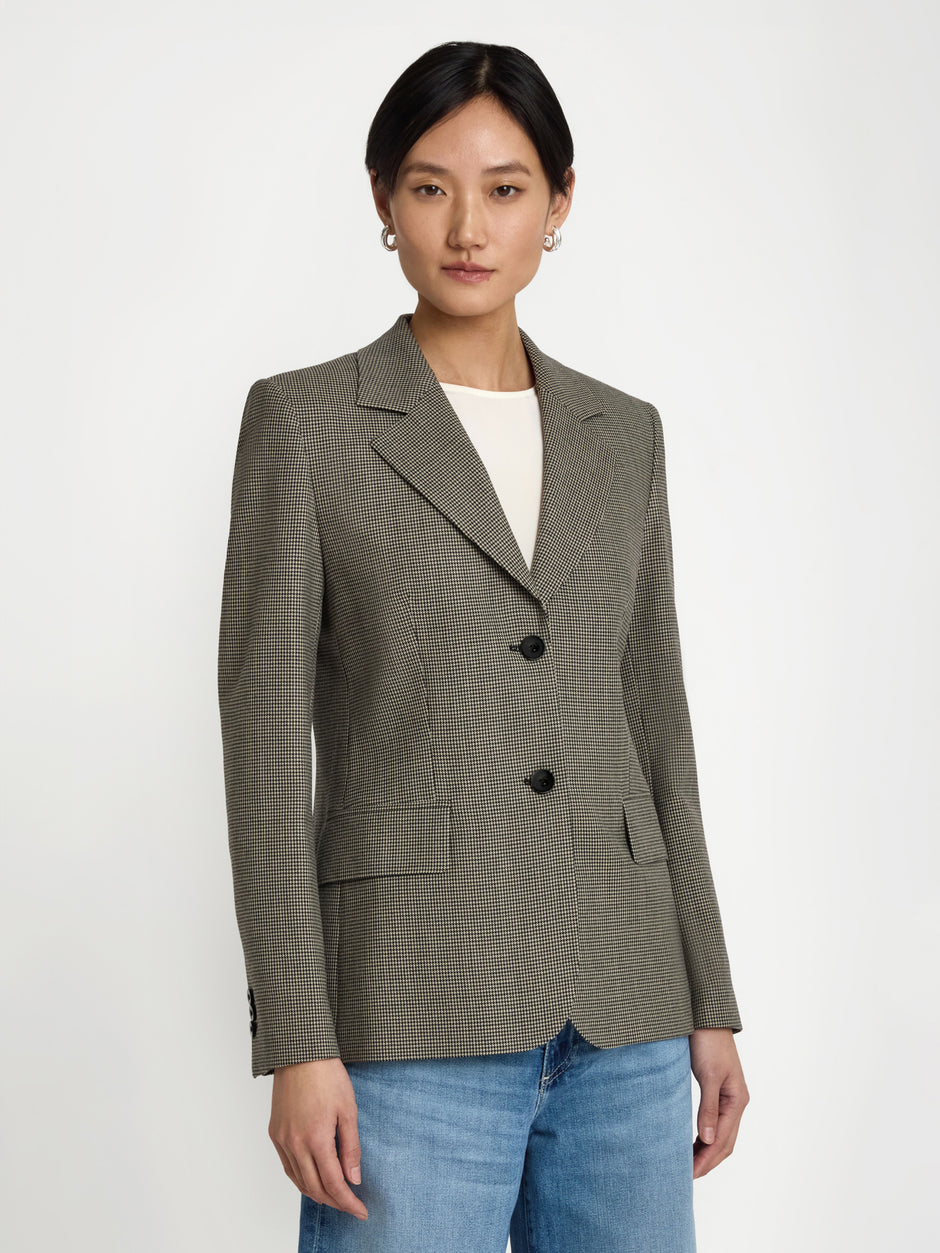 • Black camel single-breasted Dax jacket in mini houndstooth by Judith and Charles, notch lapel, flap pockets, sleeve vent with 3 buttons, made in Portugal with Italian fabric