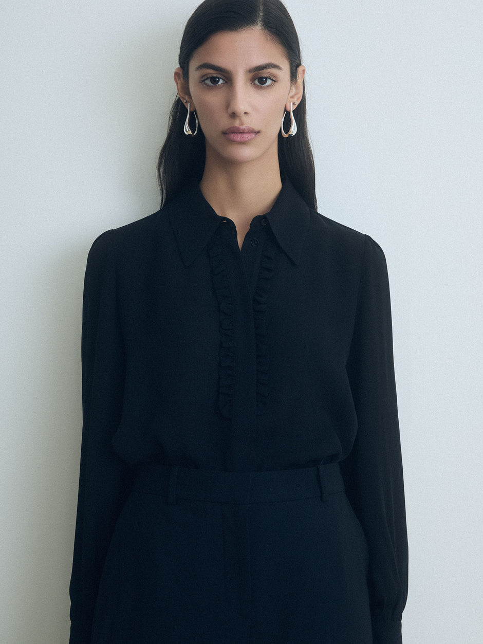 Silk blouse with a classic shirt collar and concealed button placket. Features a ruffle detail at the front.