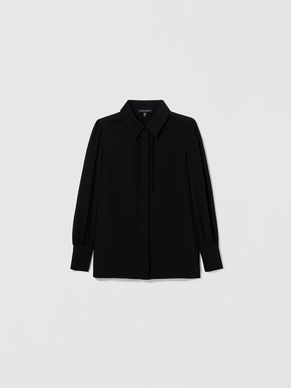 • Black silk blouse by Judith & Charles featuring a shirt collar, hidden button placket, and double-layer ruffle detail at the front.