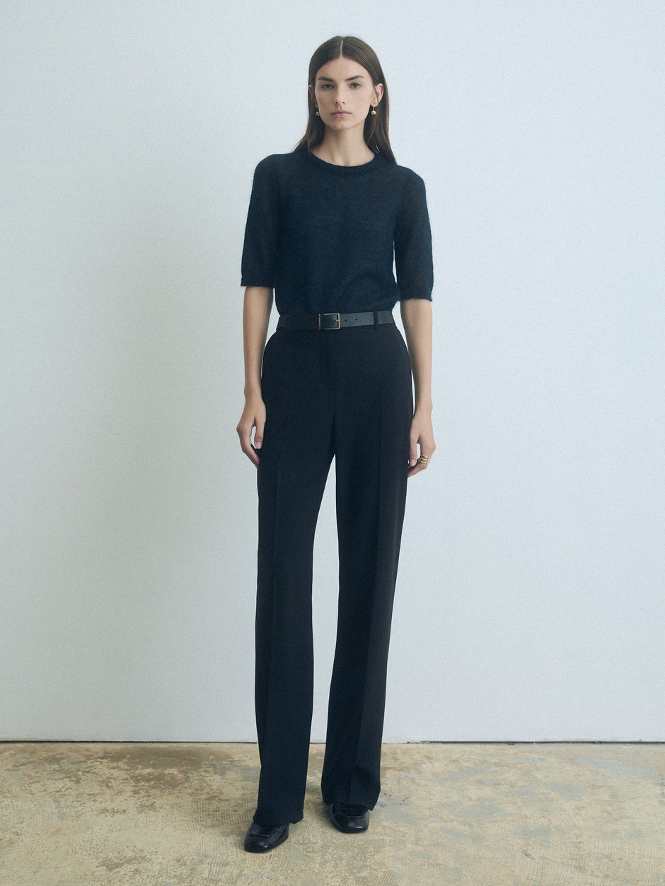 Lightweight mohair pullover with a crew neck and cropped fit. Unlined.