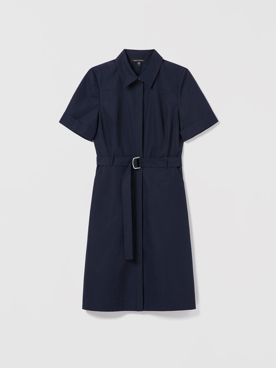 • Judith & Charles navy poplin shirt dress with short sleeves, front buttons, slash pockets, and self-belt