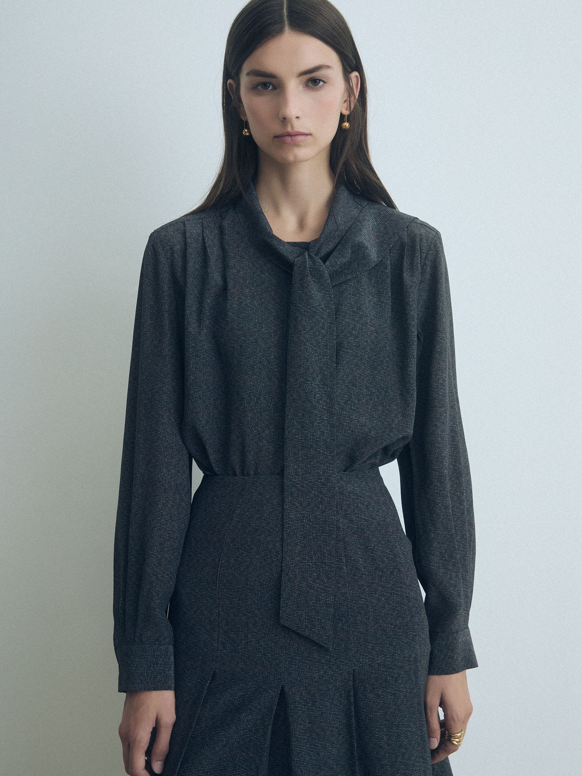 Long-sleeve pleated silk blouse in plaid print with tie neck.